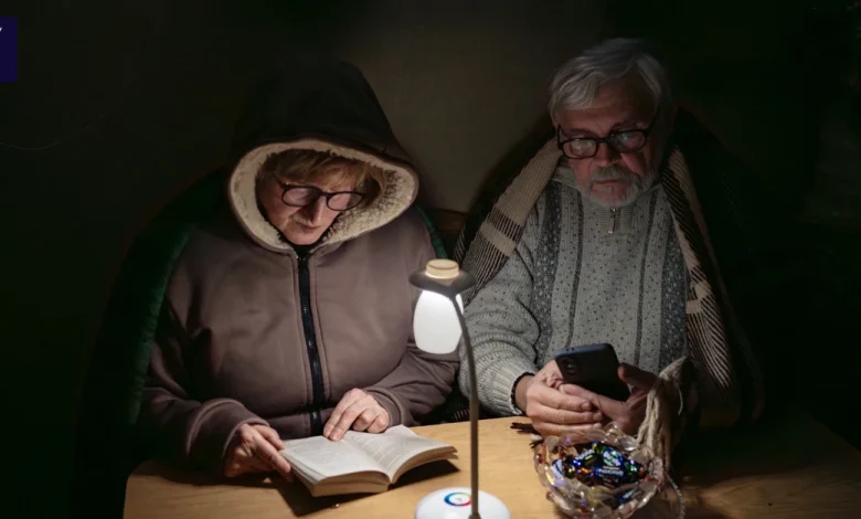 Die batteriebetriebene Tischlampe erhellt zumindest den Küchentisch. Dahinter sitzen an einem Montagabend Ende Januar Mykola und Ljubow auf einer Eckbank. Er ist 73 und seine Frau 68 Jahre alt. Sie trägt eine lammfellgefütterte Kapuzenjacke, er einen Wollpullover mit Rollkragen. Sie liest ein Buch, er schaut Nachrichten auf seinem Mobiltelefon. Beide haben je eine Wolldecke um ihre Schultern gelegt. „So verbringen wir jetzt viele Abende“, sagt Mykola.
