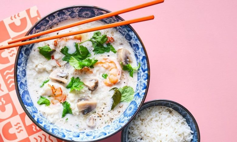 Die traditionell thailändische Reissuppe mit Garnelen erhält ihr besonderes Aroma durch Kokosmilch, Galgant, Zitronengras und Kaffir-Limettenblättern.