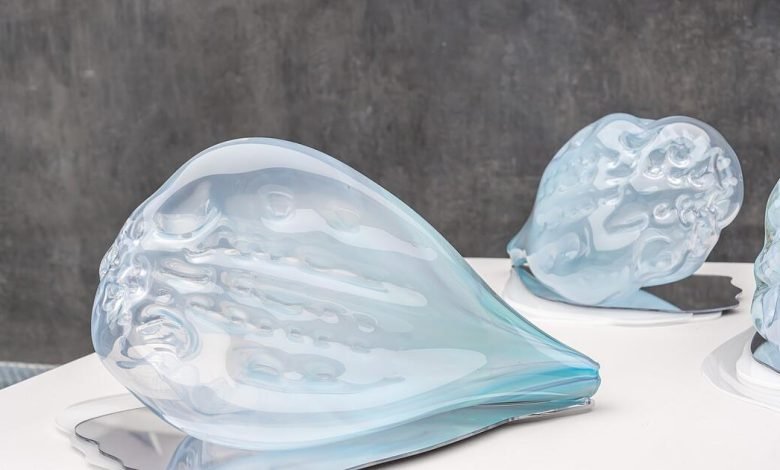 Dazu passen auch ihre größren Glasarbeiten, die wie Eisskulpturen von Schnecken und anderen organischen Lebewesen wirken. Sie sind robust – und doch hat man durch die Eis-Assoziation das Gefühl, auch sie könnten schmelzen, wodurch sie etwas Flüchtiges, fast Melancholisches bekommen (je einer dieser „Last Night’s Dreams“ kostet 2900 Euro). Gedanklich sind also auch Klimaerwärmung oder das Auftauen des Permafrostbodens im Raum, sind freudige Frühlingserwartung und Bedrohung hier zusammengespannt.