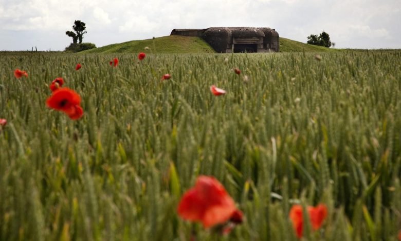 Mohnblumen wachsen auf einem Feld rund um einen deutschen Bunker aus dem Zweiten Weltkrieg.