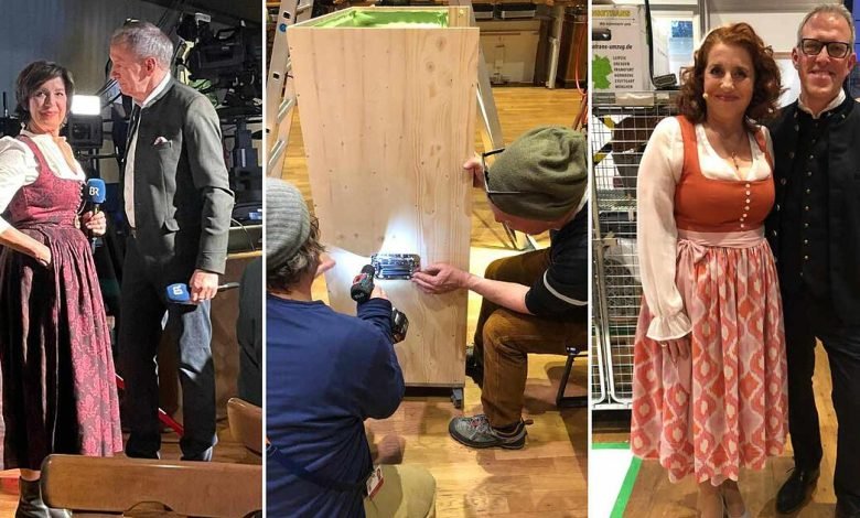 Wie die AZ vor Ort beobachten konnte, wurde bis zur letzten Sekunde an den Feinheiten noch geschliffen. Ob da noch am Bühnenbild gebastelt werden musste? Nein, betonten zwei Produktionsmitarbeiter: “Das ist die Transportbox für das Rednerpult, an dem Stephan Zinner später die Fastenpredigt hält. Und da kommt das Pult später wird rein und wird ein Jahr lang eingelagert.”