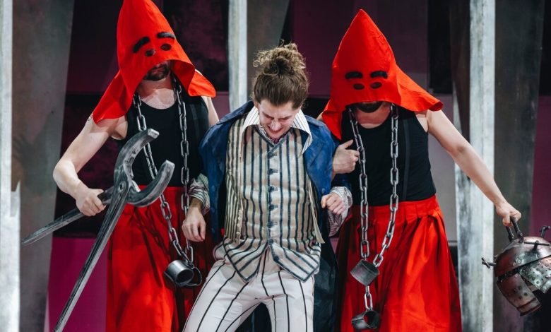 Die Inszenierung der Regisseurin Brigitte Dethier und die Kostüme von Carolin Mittler charakterisieren die Figuren ratzfatz, da bleibt kein Zweifel. Das Kleid der Hofdame Knochen ist um die Knöchel so eng, dass sie nur mit Tippelschritten gehen kann, bedrohlich schwanken ihr Haarturm und ihre Sopranstimme (Alexandra Oomens) sticht wie ein Speer in die Luft.