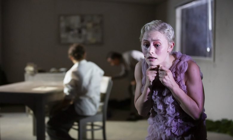 Die Bühne ist expressionistisch angeschrägt (Maria Strauch), Moos überzieht die Wände, draußen plärrt der Regen, und dieser eröffnet den Abend auch in Gestalt von Nina Wolf, die eine Wolke mit Regenschnüren performt, eine schöne Idee, doch die Ausführung gerät langatmig.