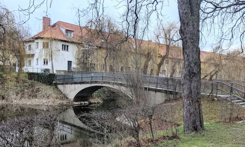 Wir verlassen die Siedlung über die Brücke und gehen gleich rechts weiter am Weiher entlang. Nach 170 Metern überqueren wir an der Ampel die Röblingstraße und unterqueren wenige Meter weiter die S-Bahnlinie.