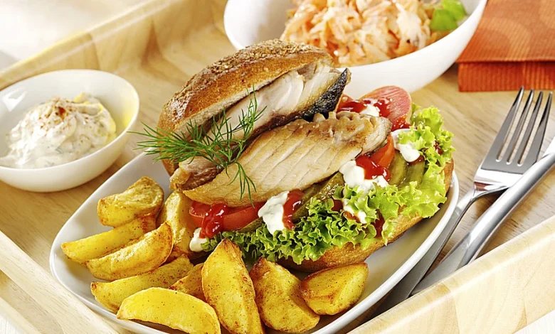 Die Makrelenfilets in Öl braten. Die Brötchen halbieren. Auf die untere Brötchenhälfte das gebratene Fischfilet legen, darauf Tomatenketchup und Remoulade, die Tomaten- und Gurkenscheiben und den Salat schichten. Obenauf die obere Brötchenhälfte legen.