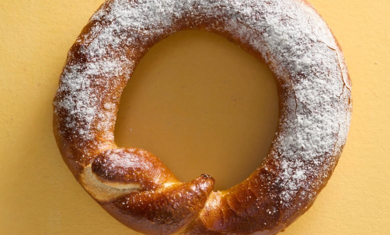 Der für die obige Teiglingsmenge ca. 40 cm lange Strang wird zu einem Ring geformt, dessen Enden sich ganz dezent „umarmen“. Sie reißt kaum auf, wird auch nicht geschnitten, geht deshalb mit voller Gare (also reifer als die anderen Brezel-Arten) in den Ofen.
