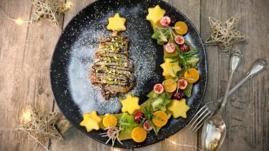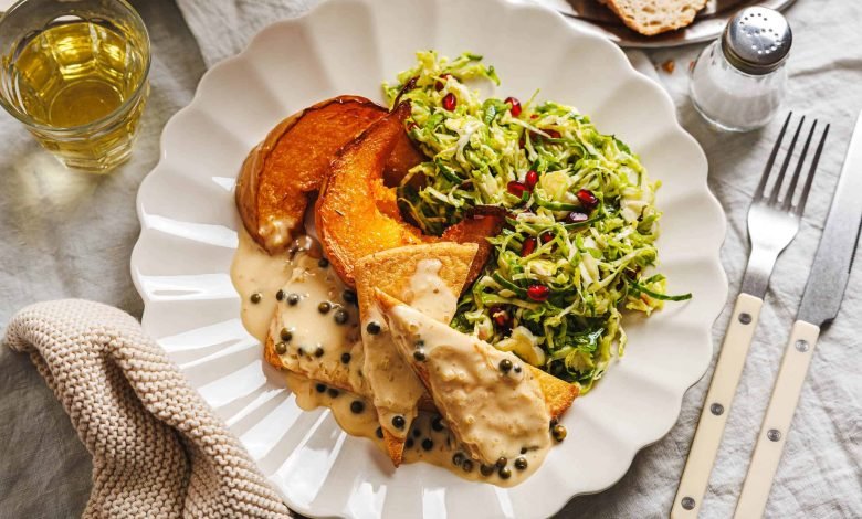 Knödel und Braten sind natürlich ein Muss in der kalten Jahreszeit. Aber dazwischen darf’s auch mal ein Festessen sein, das nicht gleich nach Winterschlaf verlangt. Zum Beispiel gebackene Kürbisspalten & Tofu-Filets mit einer cremigen Grünen-Pfeffer-Sauce und frischem Rosenkohlsalat.