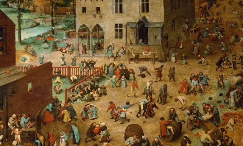 Es wuselt auf dem Gemälde: Mehr als 200 Kinder spielen Blindekuh und Bockspringen, machen Handstand und Purzelbäume. Was darauf fehlt: Rutsche, Schaukel, Karussell. Das Gemälde von Pieter Bruegel dem Älteren gilt als Enzyklopädie der Kinderspiele. Gemalt hat er es im Jahr 1560.