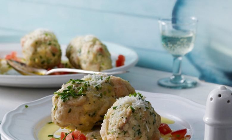 Die Zwiebel und den Knoblauch fein hacken und in einer Pfanne mit 1 EL Butter glasig anschwitzen. Zu den eingeweichten Brotwürfeln geben. Mit Salz und Pfeffer würzen und mit Mehl und Semmelbröseln binden. Den Bergkäse in kleine Würfel schneiden und unter die Masse mischen. Den Teig im Kühlschrank ca. 1 Stunde ruhen lassen und nochmals leicht durchkneten.