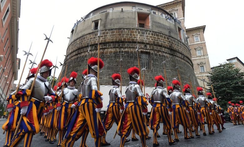 The-new-Swiss-Guards-pass-near-the-Vatican-bank-IOR-located-in-the-tower-of-Niccolo-V-at-the-Vatican-on-May-6-2015-The-Vatican-s-Swiss-Guards-swore-in-32-new-recruits-The-new-recruits-joined-their-ranks-in-an-elaborate-swearing-in-ceremony-The-ceremony-is-held-each-May-6-to-commemorate-the-147-Swiss-Guards-who-died-protecting-Pope-Clement-VII-during-the-1527-Sack-of-Rome-Then-each-new-recruit-grasped-the-corps-flag-and-raising-three-fingers-in-a-symbol-of-the-Holy-Trinity-swore-to-uphold-the-Swiss-Guard-oath-to-protect-pope-Francis-and-his-successors-The-Swiss-Guard-founded-in-1506-consists-of-100-volunteers-who-must-be-Swiss-nationals-Catholic-single-at-least-174-cm-5-feet-8-inches-tall-and-beardless-Photo-by-Eric-Vandeville-ABACAPRESS