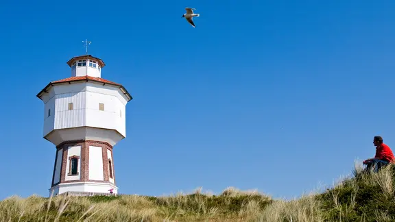 Wahrzeichen Langeoogs ist der 15 Meter hohe Wasserturm. Er steht auf der Kaapdüne, am Weg vom Zentrum zum Strand. 1909 wurde er als Seezeichen und Wasserreservoir erbaut – ist aber kein Leuchtturm. Von der Aussichtsplattform haben Besucher einen herrlichen Blick über die gesamte Insel. Bei schönem Wetter reicht die Sicht sogar bis zu den Nachbarinseln Baltrum und Spiekeroog.