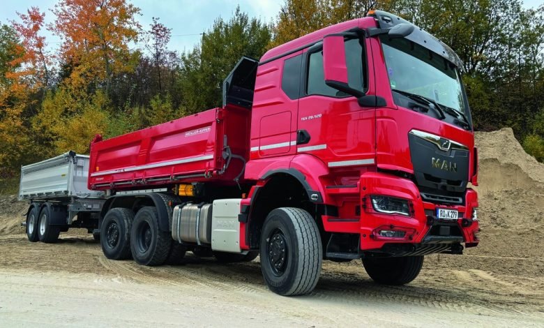 Dreiachs-Kipper haben hinten immer zwei angetriebene Achsen? Nein, sagt MAN und schickt den TGS 28.520 6×4-4 ins Rennen. Für den Test führt der Münchener noch einen passenden Humbaur-Trailer mit.