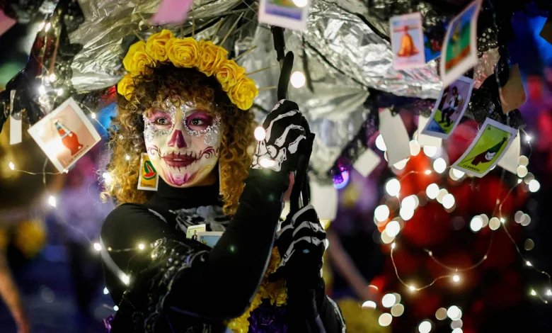 Mexiko feiert seine Toten: Eine als Skelett Catrina verkleidete Frau nimmt an der farbenfrohen Catrina-Parade teil, die vor dem Tag der Toten in Mexiko-Stadt stattfindet.