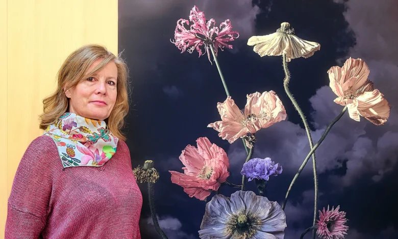 Ein praktisches Hilfsmittel hat die Künstlerin in den „kleinen Aperol-Bitter-Flaschen“ gefunden, in die sie ihre Pflanzen steckt. „Und dann wird von links nach rechts und von vorn nach hinten geschoben.“ Ein Prozess, der dauern könne. Auch mal ein paar Tage. Wenn das natürliche Licht nicht passt, hilft sie mit Scheinwerfern nach. Als Hintergrund dienen ihr ausgedruckte Fotografien, die sie wie Leinwände verwendet.