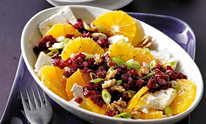 Für den farbenfrohen Orangensalat nehmen wir Rote Bete aus dem Glas. Die lässt sich schneller verarbeiten, und ihre Säure harmoniert schön mit der Orangen-Süße.