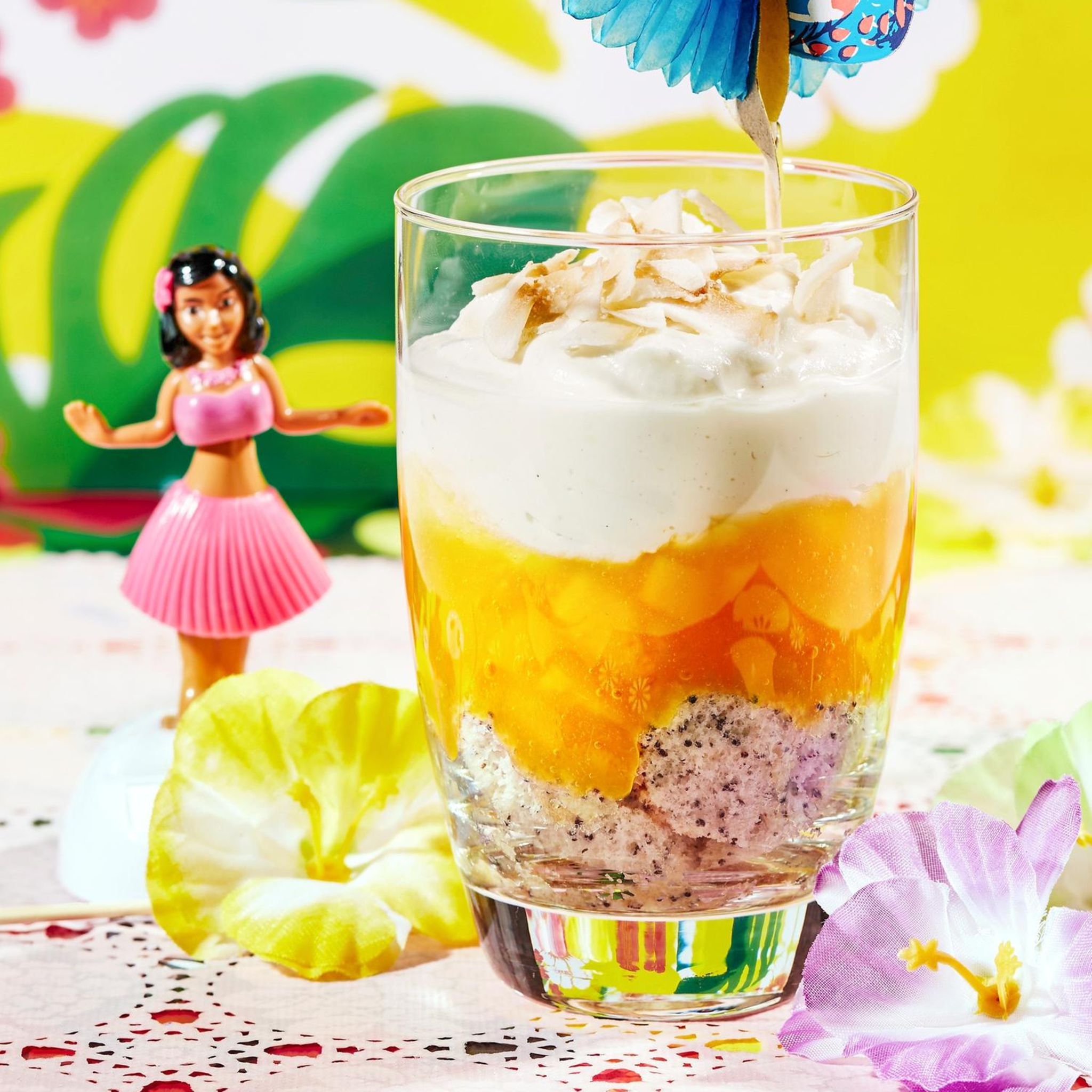 Für diesen superfruchtigen Trifle wird ein exotisches Mango-Orangen-Püree mit selbst gebackenem Mohnbiskuit und Schoko-Sahne-Creme eingeschichtet.