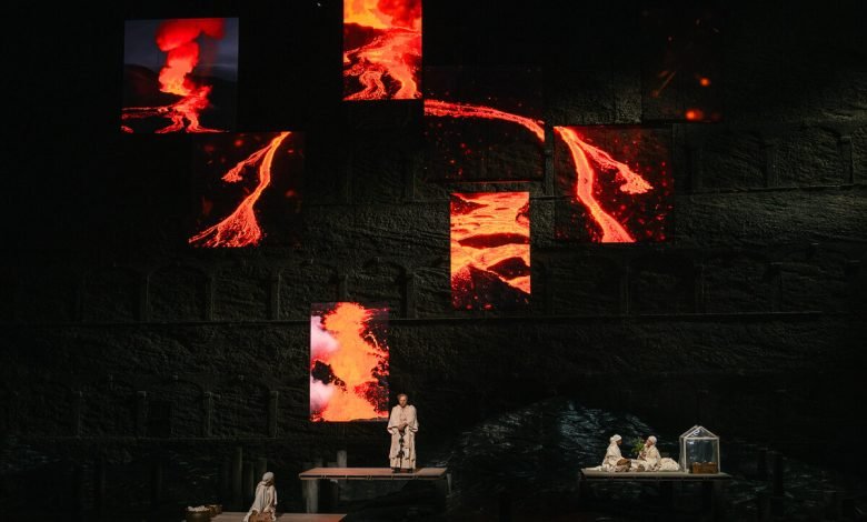 Anders als bei seinem „Parsifal“ (in Wien) und dem „Lohengrin“ in Paris überblendet Kirill Serebrennikow die Vorlagen nicht mit den Verwerfungen unserer aus den Fugen geratenen Gegenwart oder der näheren Vergangenheit. Auch er nimmt wieder als sein eigener Ausstatter die außergewöhnliche Spielstätte als Steilvorlage für seinen Zugang an. Der Boden wirkt wie erstarrte Lava oder ein ausgetrockneter Fluss. Ein Hügel gefrorenen Wassers hat offenbar die Stelle des Rheingoldes (als wahrer Schatz?) übernommen.