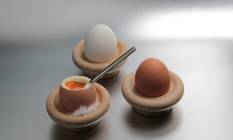 Obwohl Eierbecher zu den kleinsten Formaten in Sachen Geschirr gehören, holen Designer traditionell viel aus ihnen heraus. Die aus der Bernadotte-Kollektion von Georg Jensen sind legendär, beim „Cico“ von Alessi gehören sogar gleich Löffel und Salzstreuer dazu. Die beste Neuentdeckung kommt aus Istanbul von Atelier Barb. Die beiden Künstler Safiye Ozkan und Haydar Bayindir arbeiten in ihren Designs viel mit Abfall und organischen Materialien. Ihre schlicht schönen „egg cups“ halten die Eier nicht nur, sie bestehen quasi auch daraus: Das braune oder grünliche Bioplastik wird aus einem Dutzend Eierschalen hergestellt. Das Material soll bis zu 15 Jahre lang halten, ist dann aber komplett biologisch abbaubar. Die Modelle „Petal“ oder „Orb“ hingegen sind aus upcyceltem Aluminium gefertigt und so geformt, dass sie sich nahezu endlos stapeln lassen, um dann kunstvolle Skulpturen zu bilden. Vorausgesetzt natürlich, man hat Verwendung für so viele Eierbecher in seinem Haushalt.