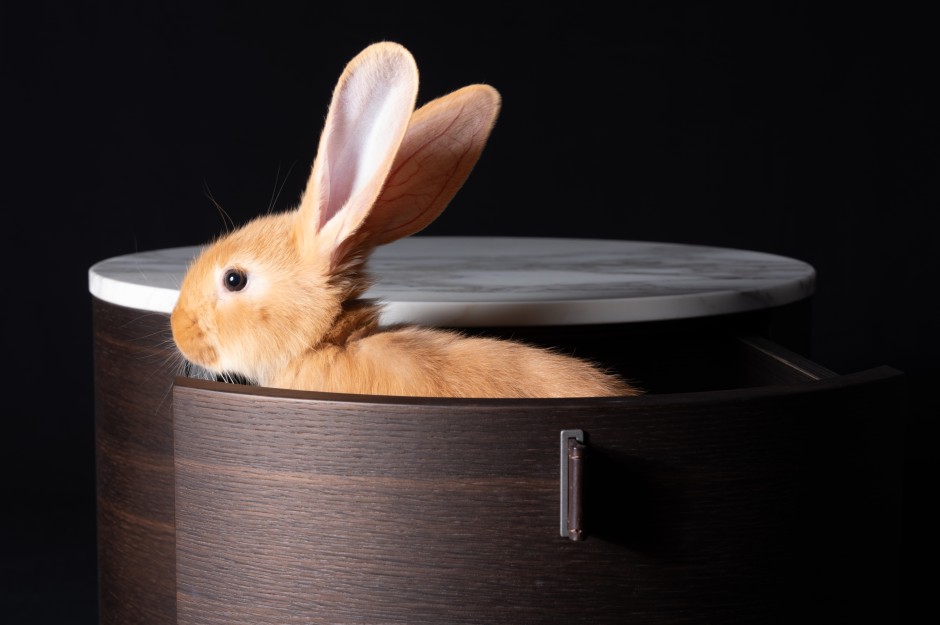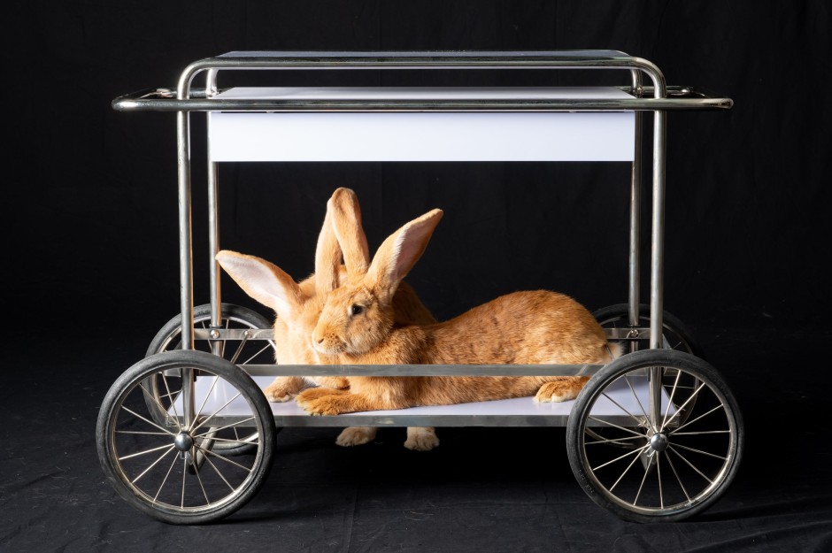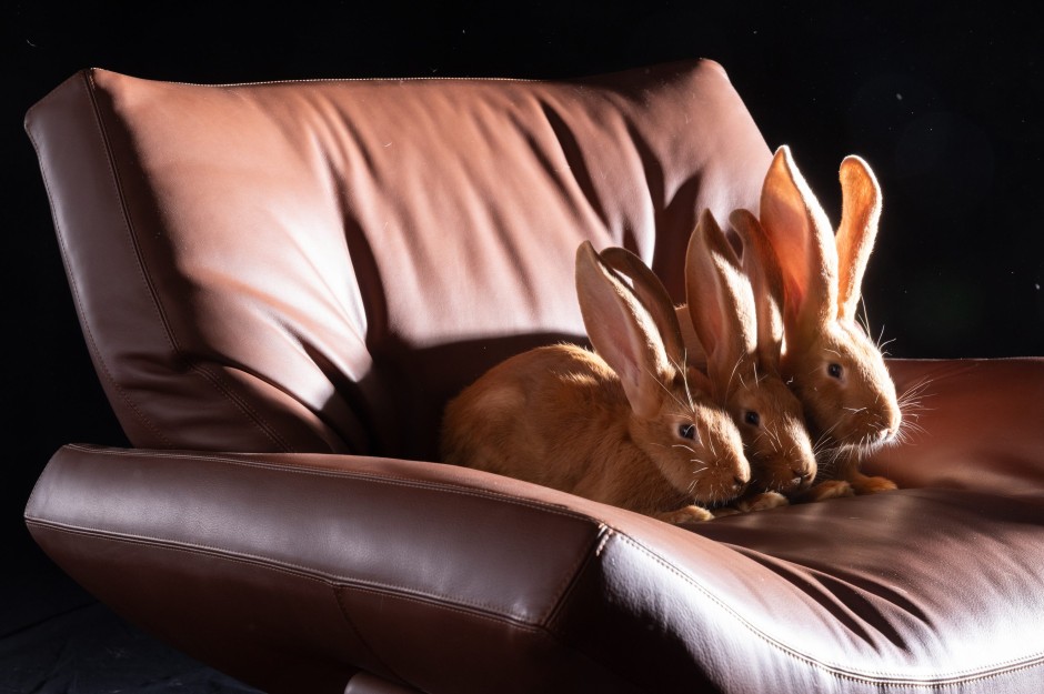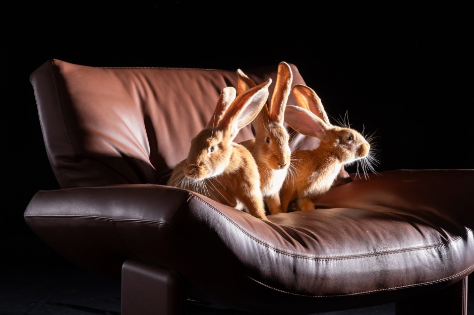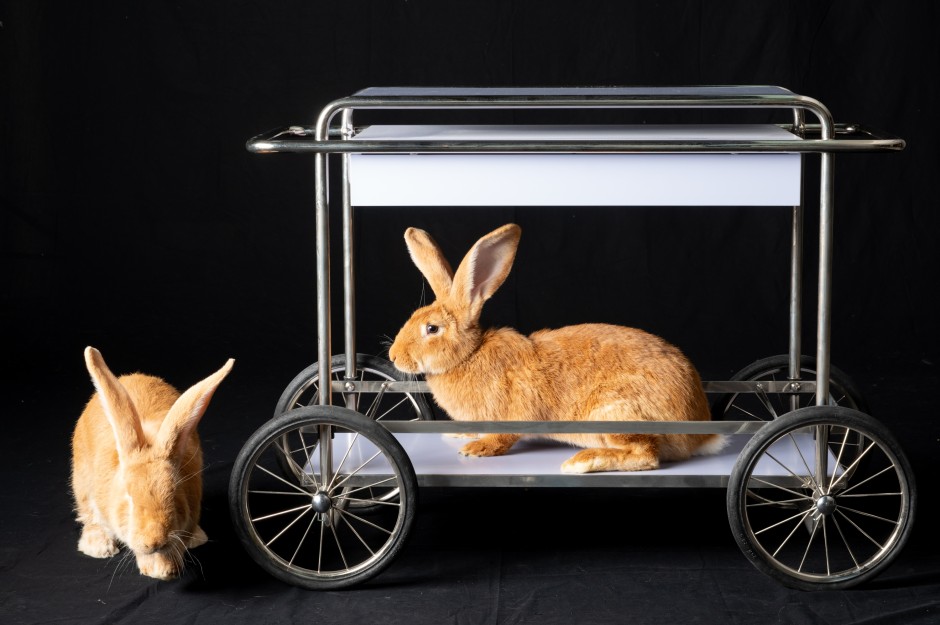 Möglicherweise war es das erste Fotoshooting dieses Magazins, aber auch dieser Zeitung, bei dem Kaninchen-Nachwuchs gezeugt wurde – denn Little Joe konnte einfach nicht die Pfoten von der zugegeben sehr hübschen Kaninchendame Lilli lassen. Zuvor hatte er das auf dem Konsolwagen von Tecta sitzende Weibchen zu bezirzen versucht, indem er um das Möbel hoppelte und sie immer wieder interessiert beschnupperte. Die Hasenartigen gelten eben nicht umsonst als Symbole für Fruchtbarkeit. Vielleicht ist es etwas indiskret, aber von dem Spektakel haben wir ganz schamlos Handy-Videos für unsere Instagram-Story aufgenommen. Unser schwarzer Fotohintergrund aus Stoff, den Frank Röth am Abend zuvor gebügelt hatte, der ist jetzt voll mit Kaninchenhaaren.
