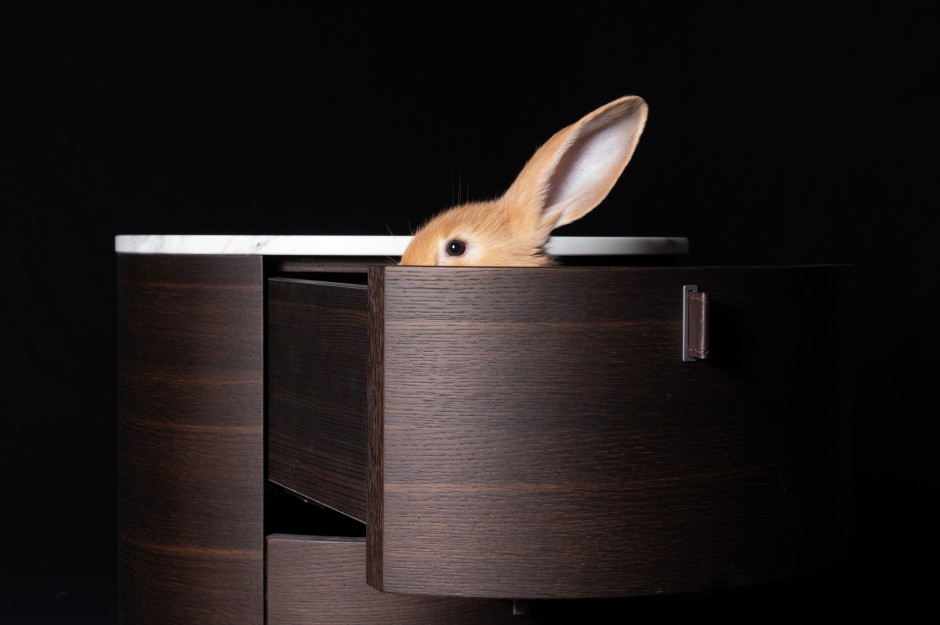 Mit Deckplatte aus Marmor, Leder oder Holz sowie zwei Schubladen: Knut zählt zu den Halbstarken unter unseren sieben Riesenkaninchen und spitzt im Nachttisch Onda von Paolo Piva (Poliform) seine Ohren.