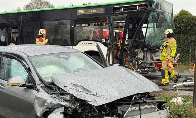 Ein vermutlich mit zahlreichen Kindern besetzter Bus ist in Dorsten am nördlichen Rand des Ruhrgebiets mit einem Auto kollidiert. Wie viele Kinder verletzt sind und wie schwer, war laut Polizei zunächst noch unsicher. Die Feuerwehr wurde wegen eines Massenanfalls an Verletzten alarmiert. Fotos zeigen, dass der Bus durch den Zusammenprall im vorderen Bereich stark beschädigt wurde – und das Auto ebenso.