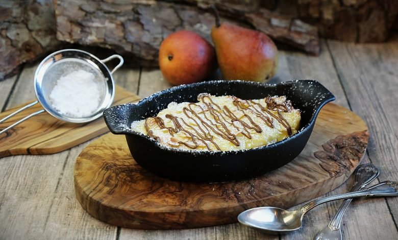 Pfannkuchen-Auflauf mit Birne, ob als Dessert oder als Süßspeise mit einer leckeren Suppe vorab, ist einfach, vegan & lecker. Probiert…