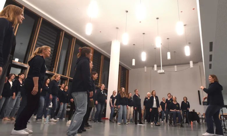 Bevor es richtig losgeht „wechseln wir jetzt erst einmal zur Luftpumpe“, weist Mareike Meise ihre Sängerinnen an. Nun ziehen alle im Gleichtakt mit beiden Händen einen unsichtbaren Griff nach oben, „Pffft-Pffft-Pffft!“, erschallt es aus 40 Mündern. Die nächste Übung klingt eher nach Staubsauger: „Wwwwwwwwww!“ Gaumen, Lippen müssen geschmeidig werden, der Körper locker. Manche Frauen sind gerade erst von der Arbeit gekommen, haben daheim das Kind ins Bett gebracht oder sich im Fitness-Center ausgepowert. Man muss erst mal den Alltag abstreifen, um richtig anzukommen in der Musik.