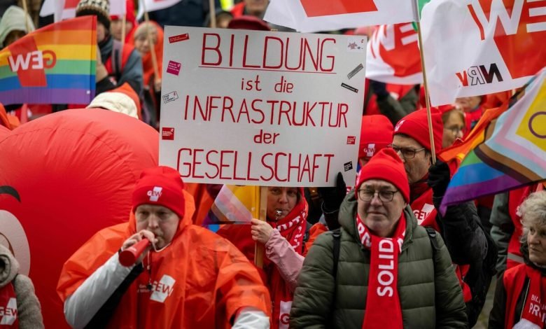 In den Tarifverhandlungen mit den Ländern fordert Verdi 7 Prozent mehr Geld im Monat, zur Stärkung unterer Lohngruppen aber mindestens ein Plus von 300 Euro. Bereits in den vergangenen Wochen hatte es ausgeweitete Warnstreiks in etlichen Bundesländern gegeben, auch an Schulen vor allem in Ostdeutschland. Die Gewerkschaften wollen zum Auftakt der dritten Verhandlungsrunde in Potsdam den Druck verstärken. In den zwei vorherigen Verhandlungsrunden hatten die Arbeitgeber kein konkretes Angebot gemacht.