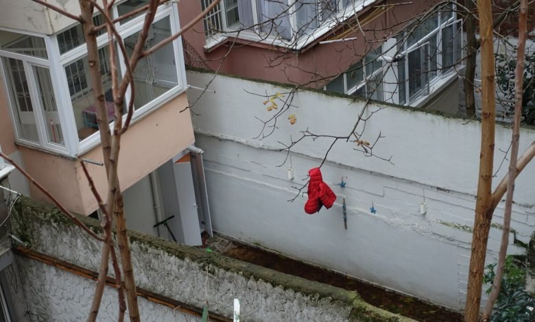 Eine leuchtend rote Daunenkinderjacke im Hinterhof eines Mietshauskomplexes in der Türkei. Sie hängt an dem Ast eines Baumes, der so über eine Mauer ragt, als wolle er seine Hände zur Hilfe nach dem verknäulten Textil ausstrecken.