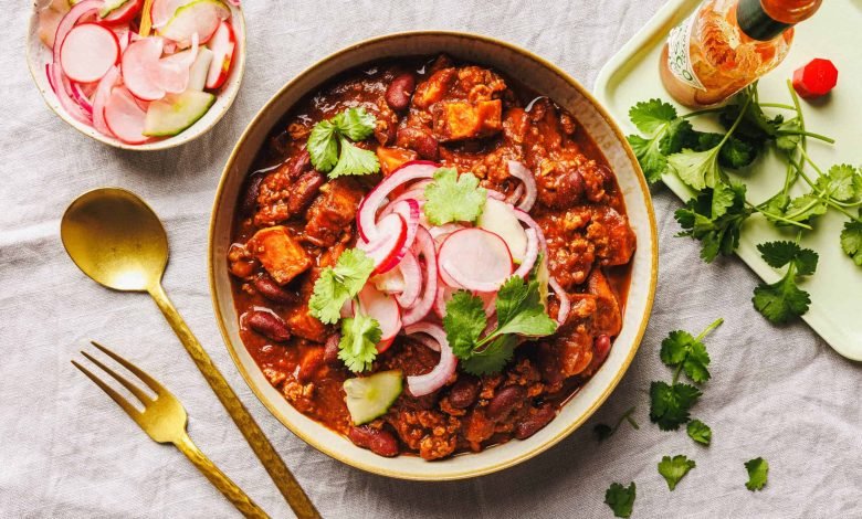 Veganes Süßkartoffel-Chili mit Kidneybohnen & Pickle-Topping · Eat this! | ABC-Z